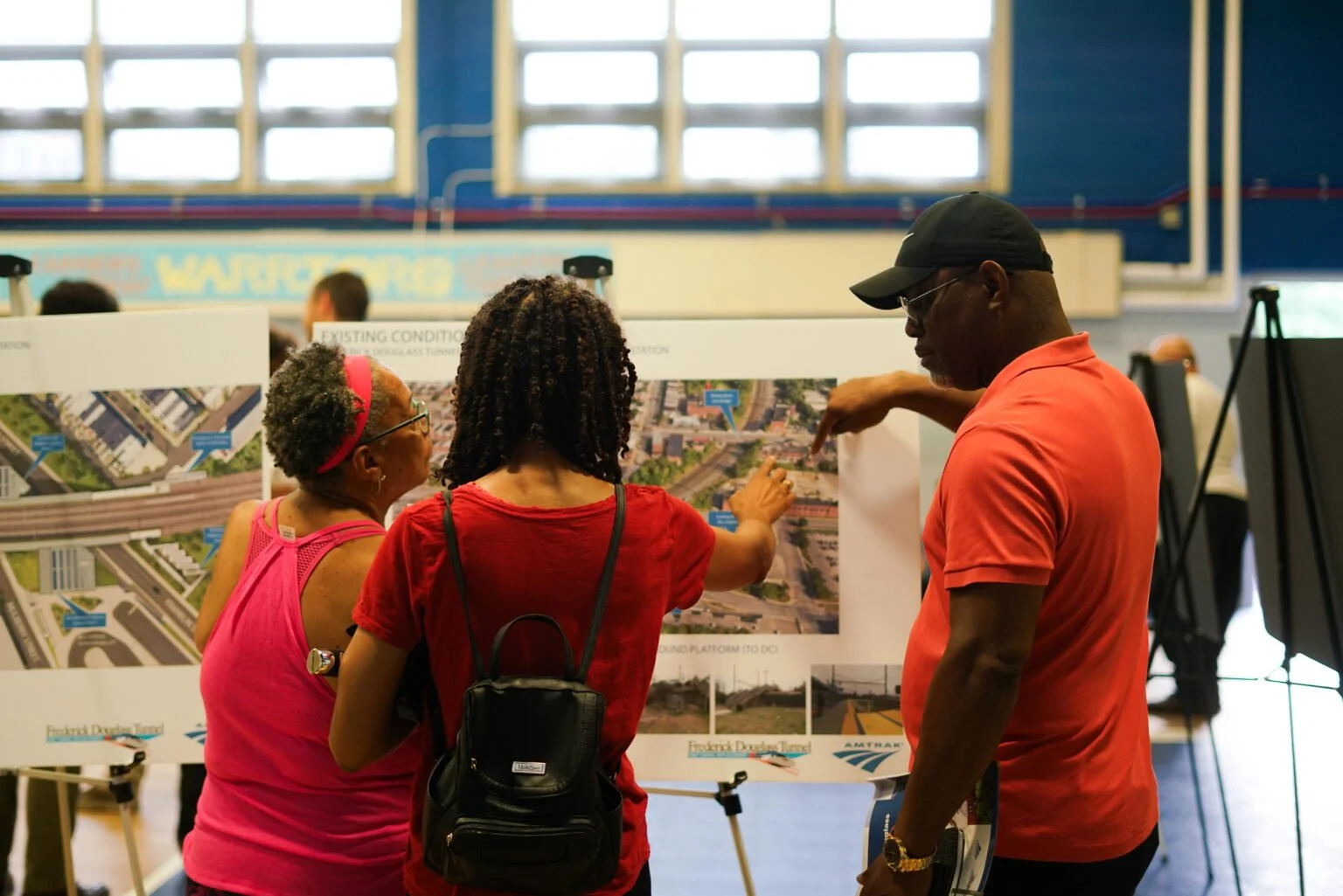 West Baltimore residents look at plans for a new MARC station and railroad tunnel. Photo by Elijah Pittman.